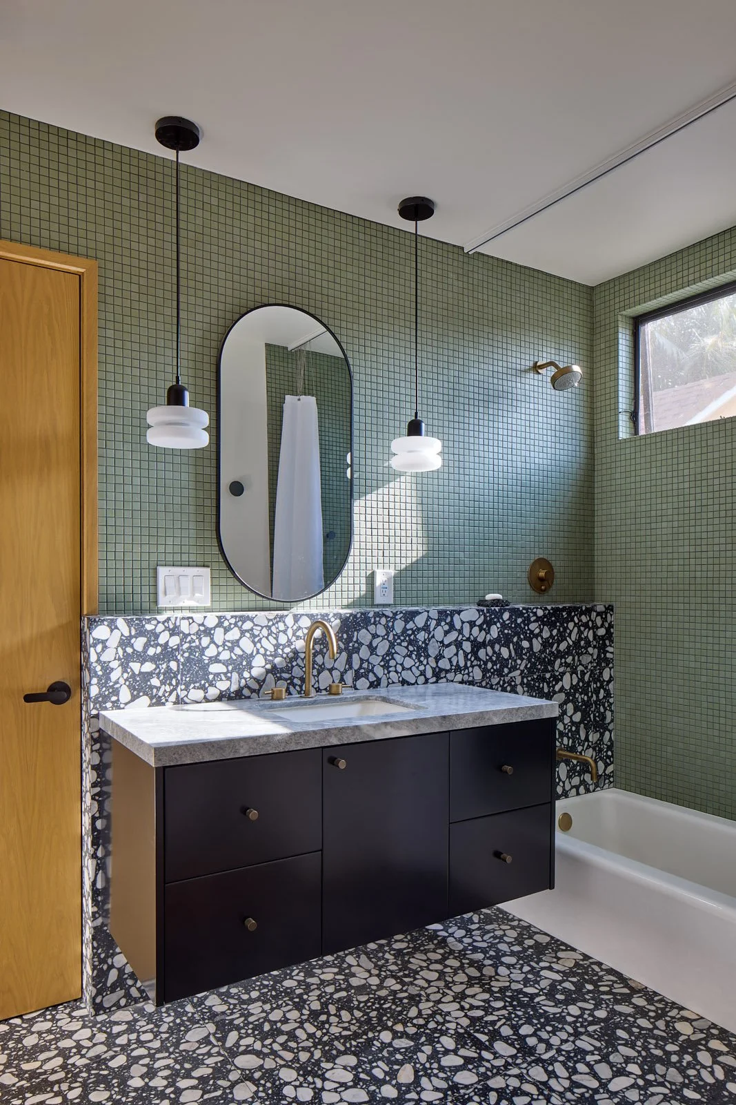 The front façade of the house mimics the cadence of the neighborhood with two pitched gables, one framing a porch and one a picture window. On the rear facade, the house takes a more modern pitched language, with wider gables framing two distinct entrances to the home’s common spaces, and to the primary bedroom, while the ADU loses the pitched reference entirely. The language thus shifts from vernacular to modern as one proceeds through the site, with shifts in form aligned with shifts in material language. The exterior brick patterns play with shifting between figure and field, where the focus alternates back and forth between patterns in the foreground and background. The solid black offset brick has a contrasting soft grey mortar that lends the configuration a graphic quality, and though bold it still acts as a background field (similar to a textured woven textile). Within the textile inspiration, the emotional parallels between fashion and personal architecture are also highlighted. Site lines, views and materials are experienced in layered relationships to one another.
